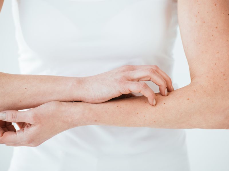 3、皮疹多发生于腰部、腹部、小腿等处,呈线状或成群的排列,儿童的损害症状常更显著,呈丘疹性荨麻疹的表现,自觉奇痒难忍,由于搔抓常见抓痕、血痂或继发感染。